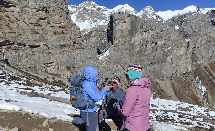 | Neem acclimatisatie serieus | Op 5.416 m is het zuurstofniveau aanzienlijk lager dan op zeeniveau, wat het risico op hoogteziekte verhoogt. | Breng voldoende tijd door in de regio Manang en volg een geleidelijk stijgingsschema. Forceer geen snelle hoogtewinst. |